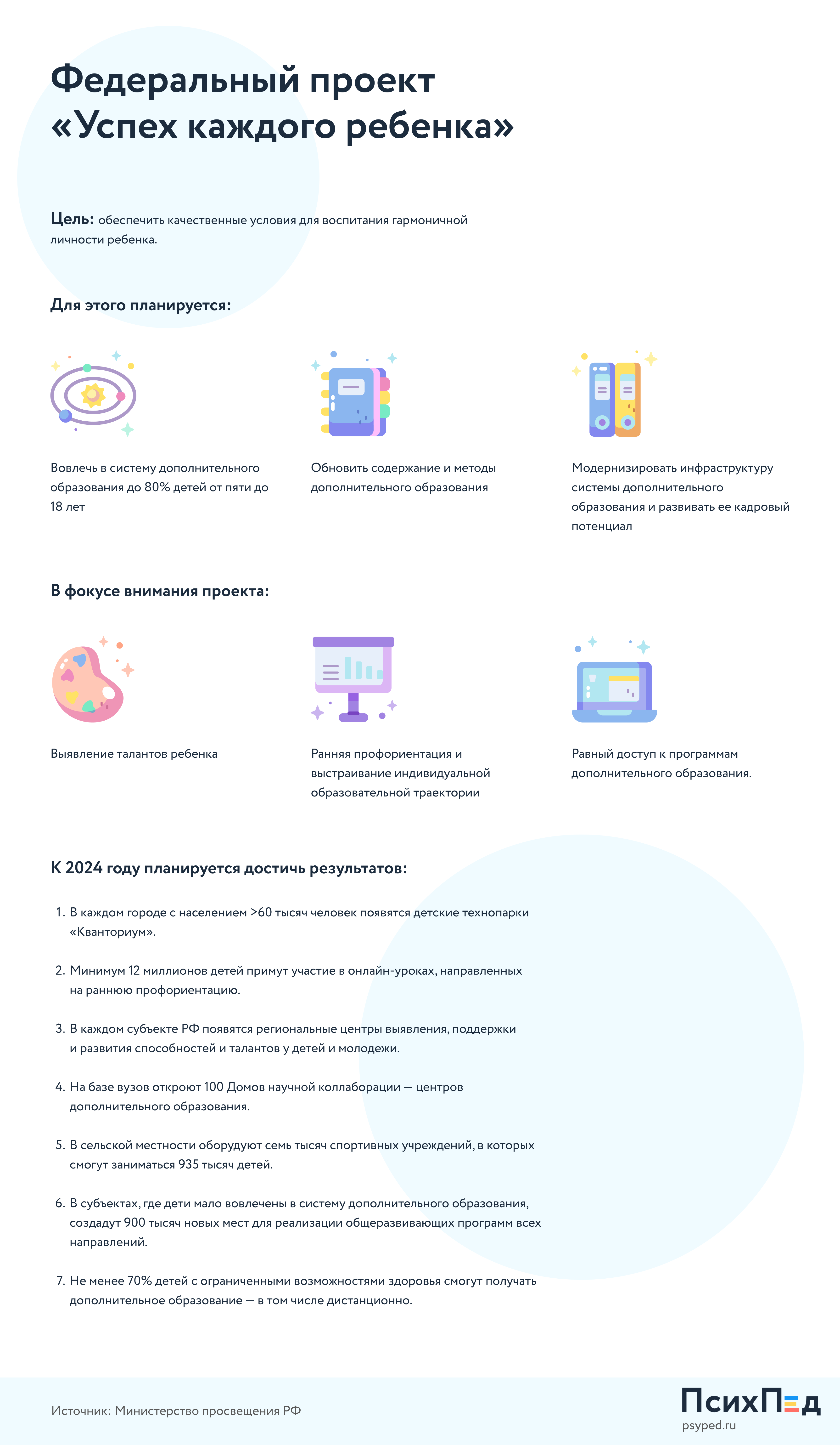 Проект призван обеспечить качественным дополнительным образованием детей, чтобы помочь им определиться с дальнейшей профессией.