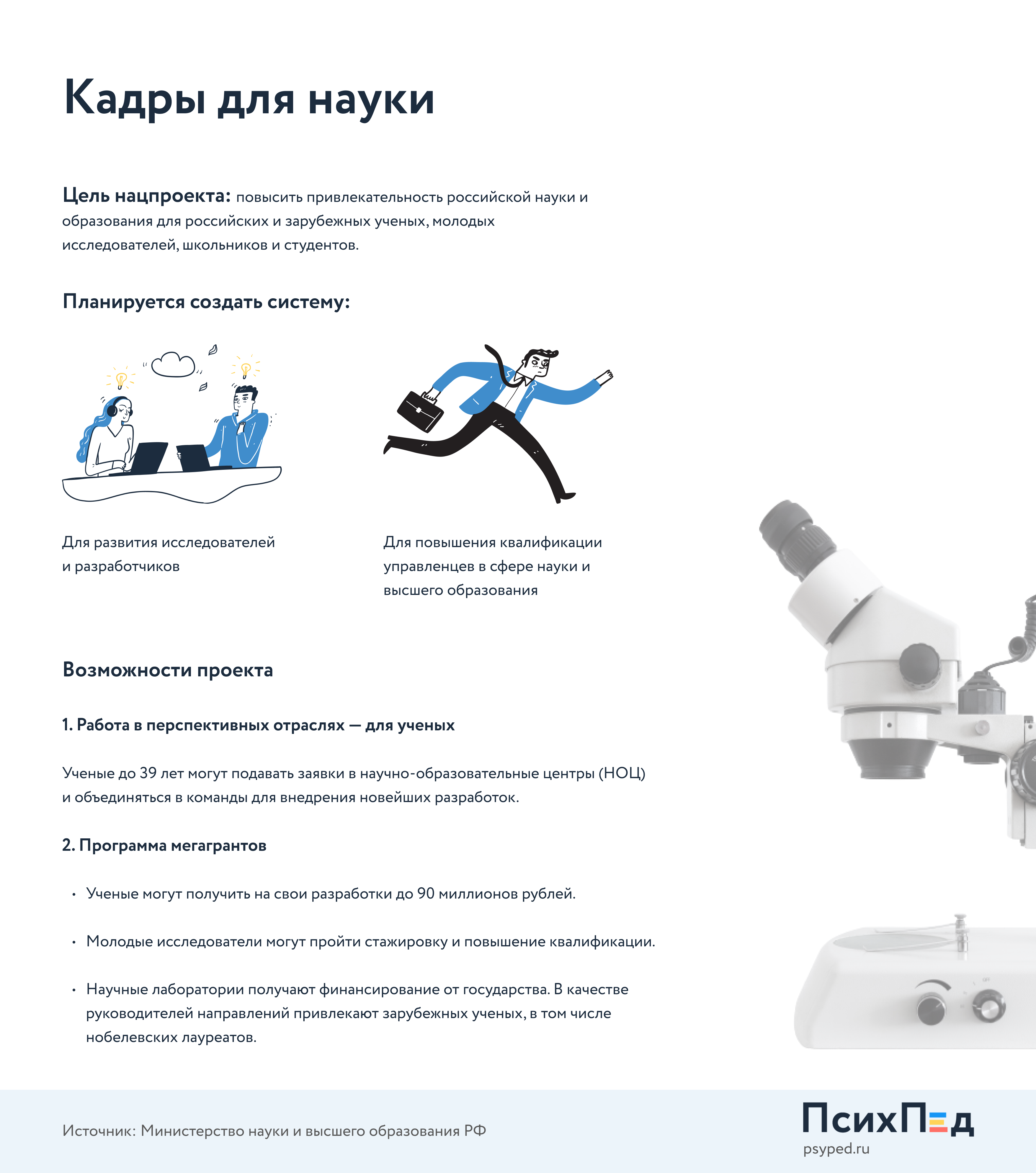 Федеральный проект «Развитие человеческого капитала в интересах регионов, отраслей и сектора исследований и разработок» входит в нацпроект «Наука и университеты». Важная инициатива проекта — работа с кадрами отрасли: улучшение условий работы, расширение возможностей для карьеры в высокотехнологичном бизнесе.